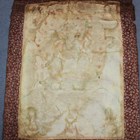 A Tibetan thangka, Qing dynasty, painted with Mahakala standing on a lotus throne with flame surround, reserved against a mountainous landscape with clouds, and five bodhisattva, black painted script to reverse, 64cm x 46cm, within floral printed silk surround and cover.