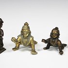 A small group of four South Indian bronze figures, late 19th century, comprising Balakrishna, modelled as a crawling baby holding a butterball, height 7cm, a smaller similar figure, height 6cm, figure of Krishna with snake and butterball, height 6.8cm, and a figure on horseback, height 7.8cm, together with two Indian carved wood figures.