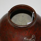 A Japanese silver inlaid bronze vase, Meiji period, the globular body covered in an iron red and brown mottled patination, inset with a silver flowerhead and two buds, between a pair of mask and loose ring handles, height 20cm (some dents to body).
