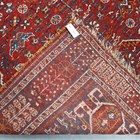 A Shiraz rug, South-west Persia, mid-20th century, the terracotta field with a lozenge medallion, profusely supported by serrated leaves and miniature guls, within a complimentary border, 260cm x 162cm.
