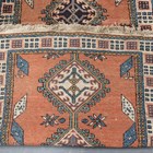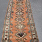A Turkish runner, mid-20th century, the pink field with a column of hooked and linked medallions, within an ivory border, 347cm x 90cm.