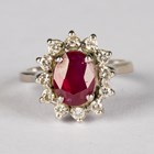 A white gold, ruby and diamond oval cluster ring, claw set with the oval cut ruby within a surround of circular cut diamonds, ring size approx K, cluster dimensions 1.5cm x 1.2cm.