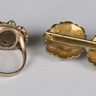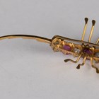 A gold, pink sapphire and colourless gem set brooch, designed as a scorpion, length 6.5cm, a turquoise triple cluster brooch, two further clusters, one of original form as an earring, the other converted for wear as a ring, and one turquoise solitaire earring.