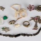 A Victorian gilt metal mounted oval porcelain brooch with floral decoration, length 6.7cm, a turquoise brooch, detailed '800', an Arts and Crafts blue paste set brooch, further brooches, six rings, a moonstone pendant with a neckchain, four enamelled badges, an oval glazed hairwork clasp and further items.