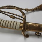 A Victorian naval officer's sword with straight single-edged fullered blade by Simpson & Rook, London, blade length 72.5cm, gilt brass hilt with lion's head pommel and folding guard, wire-bound fishskin grip and bullion dress knot, with gilt brass-mounted leather scabbard, outer black leather case and belt.