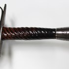 A late 17th century rapier with double-edged blade with central fullers, blade length 91cm, dish-shaped guard with a band of engraved foliate designs, tapering crossguard, spiral-carved wooden grip and foliate engraved pommel, with steel-mounted leather scabbard (faults).