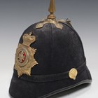 A Victorian style blue cloth helmet with spike finial, the helmet plate detailed 'Royal Sussex', and chain chin strap, height 30cm, together with a bandsman's hat and a 20th century East Yorkshire Regiment officer's peak cap.