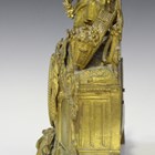 A mid to late 19th century French gilt metal mantel clock with eight day movement striking on a bell via an outside countwheel, the case surmounted with a young lady picking grapes, height 33.8cm (lacking pendulum), with ebonized stand.