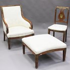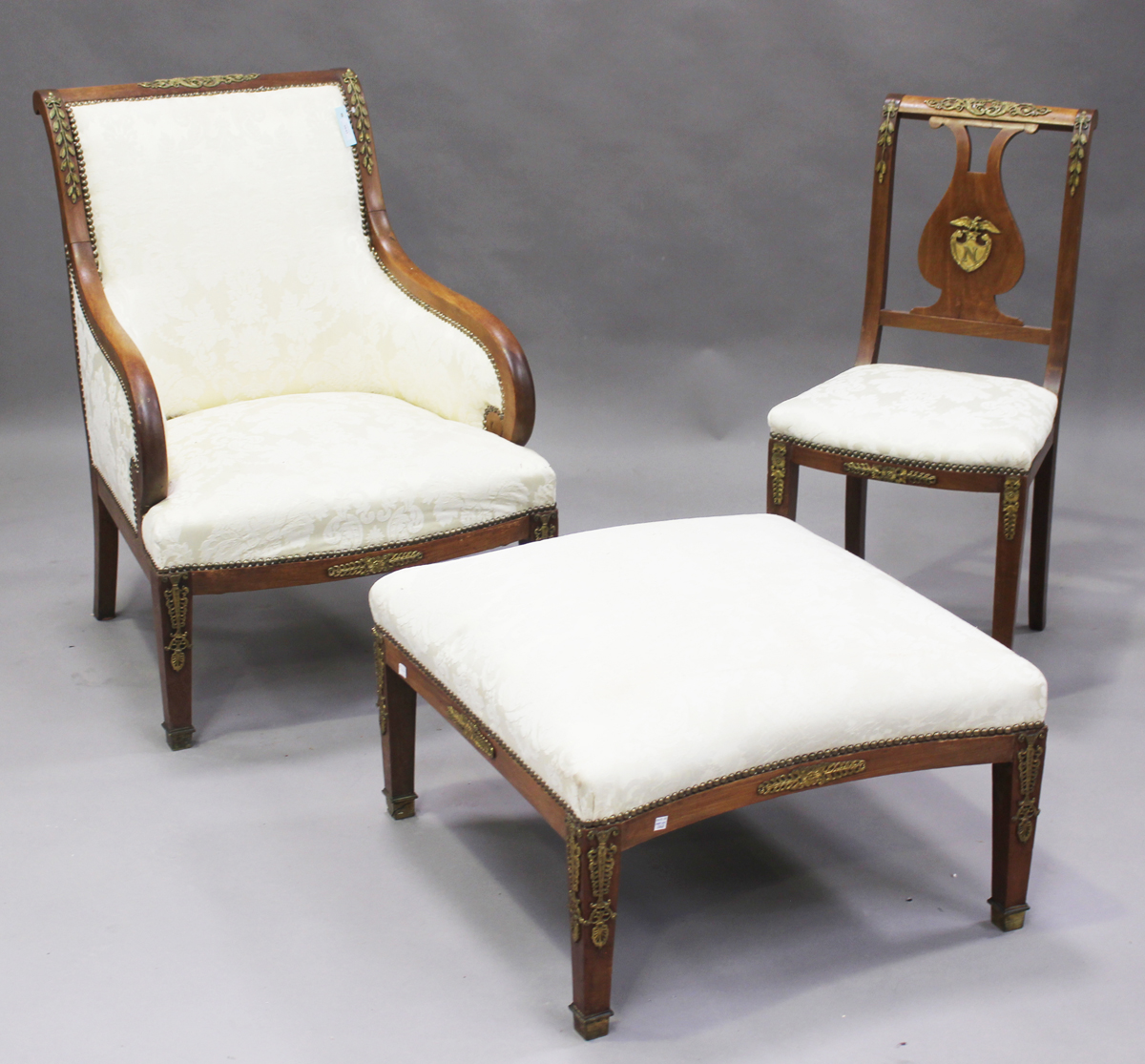 A 20th century Empire style mahogany framed salon suite, all with gilt metal Napoleonic crests and foliate mounts, comprising an armchair, height 91cm, width 57cm, a footstool and a side chair.