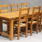 A late 20th century French oak rectangular dining table, fitted with two frieze drawers, on block legs, height 75cm, length 220cm, depth 85cm, together with a set of six matching rush seat dining chairs, height 106cm, width 46cm.