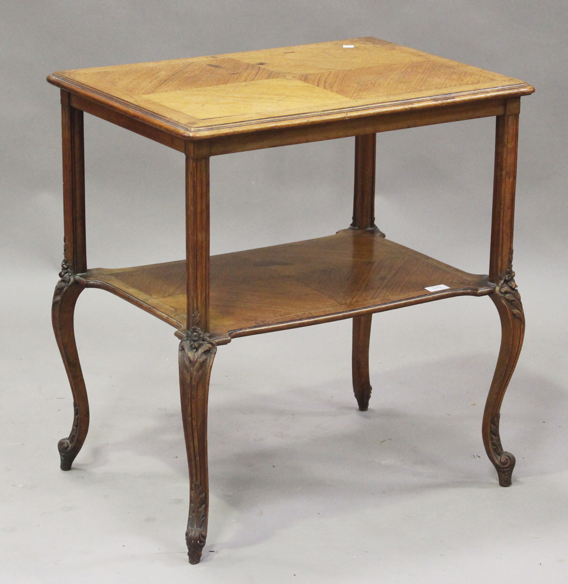 A late 19th century French kingwood and walnut two-tier étagère, raised on finely carved legs, height 71cm, width 66cm, depth 48cm.