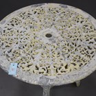 A 20th century Victorian style cast alloy garden table, the tripod legs decorated with masks, height 68cm, diameter 67cm.