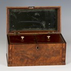 A George III figured mahogany tea caddy with overall crossbanded borders, the front with inlaid swags and urns, the interior fitted with two lidded compartments and a mirror, width 26.5cm (some faults).