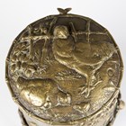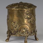 A late Victorian Aesthetic Movement cast brass tobacco jar and hinged cover, decorated in relief with chickens, sparrows and cranes, raised on bamboo-effect legs, height 14cm, diameter 12cm.