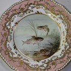 A Coalport pierced pink ground cabinet plate, late 19th century, painted by L. Besche, signed, with a pre-Raphaelite girl in a garden setting beside a statue of Cupid, green printed factory mark and gilt painted X1513, diameter 24cm, together with a Coalport plate, painted with trout by J.H. Plant, signed, diameter 23.5cm, and a Mintons plate, painted by A.H. Wright, signed, diameter 23cm.