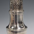 A George II silver pepper caster of baluster form with pierced dome cover and turned finial, London 1746 by Samuel Wood, height 11cm.