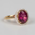 An 18ct gold ring, claw set with an oval cut shimoyo rubellite within a surround of thirty-two circular cut diamonds, ring size approx N1/2, with a certificate and case.