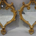 A pair of late 19th century Rococo Revival carved softwood wall mirrors, the frames with urn finials and foliate scrolls, height 86cm, width 44cm (formerly gilded and stripped).