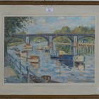 J. Knizke - View along a River with Moored Boats, oil on board, indistinctly signed, 34cm x 46.5cm , within a painted frame.