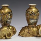 A pair of Japanese Satsuma earthenware vases, Meiji period, each elongated ovoid body painted and gilt with a dragon weaving between Kannon and arhats, supported on the back of a gilt caparisoned elephant, brown and gilt mark to bases, height 12cm, with two wood stands, together with another Satsuma vase with wood stand (faults).