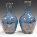 Two Japanese Koransha porcelain vases, Meiji period, each ovoid body and trumpet neck painted in gilt enriched Imari colours with chrysanthemums and peonies against a blue ground, iron red painted orchid mark to bases, height 25cm (one with chip and crack to rim), together with a Japanese Seto ware ewer, height 17cm, and a later blue and white Japanese porcelain vase, height 16.5cm.