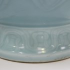 A Chinese clair-de-lune glazed porcelain vase, mark of Qianlong but 20th century or later, the globular body moulded in low relief with an archaistic taotie band above lappet panels, flanked by a pair of moulded, mask, tongue and ring handles, underglaze blue pseudo seal mark to base, height 27.5cm.
