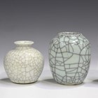 Two Chinese Guan-type crackle glazed hu vases, each pear shaped body with a pair of tubular handles to the neck, covered in a blue/grey glaze, incised seal mark to bases, height 10.3cm and 10.8cm, together with two other crackle glazed vases, heights 7.5cm and 9.5cm.