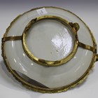 A Chinese brown patinated bronze tripod censer, late Qing dynasty, the body cast in relief with dragons amidst clouds, beneath a pair of upright dragon handles, height 11cm, together with a smaller Chinese tripod censer, height 11.5cm, and a gilt metal mounted Chinese famille rose export porcelain saucer dish, diameter 17cm (faults).