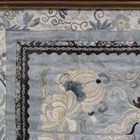 A pair of Chinese silk embroidered sleeve panels, late Qing dynasty, joined as one and worked in coloured threads with bats and fruit against a blue ground within a floral border, 60cm x 30cm, framed and glazed.