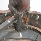A Chinese hardwood stand, early 20th century, the top inset with a rouge marble panel within a beaded lobed border, above a carved and pierced frieze, mask shouldered legs and claw and ball feet, height 45cm, width of top 41cm.