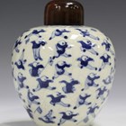 A Chinese blue and white soft paste porcelain ovoid jar, mark of Kangxi but late Qing dynasty, painted with boys, height 12.2cm, with wood cover, together with a small collection of other Chinese porcelain, including a Wanli style cinquefoil box and cover, height 9.7cm, and a blue and white saucer, 18th century, painted with figures on horseback, diameter 9.7cm (some faults).