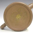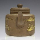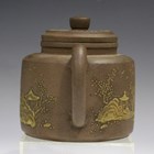 A Chinese Yixing stoneware teapot and cover, probably 20th century, the cylindrical body decorated in buff relief with pavilions in a landscape on a brown ground, impressed seal mark to base, height 11.3cm.