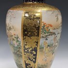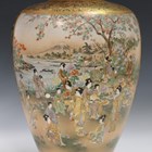 A Japanese Satsuma earthenware vase by Keizan, Meiji period, of stout ovoid form, painted with opposing figural panels, one side filled with a shoreside scene of bijin and children with Mount Fuji beyond, the other side with bijin, two gentlemen and a boy beneath a blossoming cherry tree, reserved against a dark blue ground filled with gilt overlaid decoration, iron red and gilt Shimazu mon and signature to base, height 38cm.