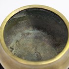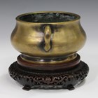 A Chinese polished bronze bombé censer, mark of Xuande but probably late Qing dynasty, the compressed circular body flanked by a pair of loop handles, cast six-character mark to base, weight 990g, width across handles 17cm, height 7.2cm, together with a hardwood stand, carved and pierced with a foliate scroll apron, diameter 14.5cm.