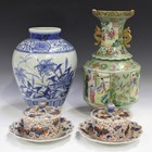 A Chinese Canton famille rose enamelled celadon ground porcelain vase, mid to late 19th century, painted with figures, birds, Buddhistic emblems, butterflies and flowers, height 34cm (section of rim missing), together with a Japanese blue and white porcelain ovoid vase, height 27.8cm, and a pair of Japanese Imari porcelain butter dishes and covers, Meiji period, painted with leaves and scrolling tendrils, height 10.3cm (some faults).
