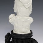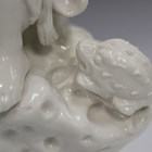 A Chinese blanc-de-Chine figure of Liu Hai and his three-legged toad, 20th century, on a naturalistic rocky base, height 19.5cm, together with an ebony stand, carved in relief with two entwined lizards, height 8.3cm, and a Japanese parquetry table-top cabinet, height 36cm.