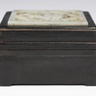 A Chinese pale celadon jade and hardwood box and cover, 20th century, of square form, the cover inset with a square jade panel, carved and pierced with a dragon medallion on a pierced ground, height 6.5cm, width 11cm.