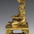 A Sino-Tibetan gilt bronze figure of Amitayus, mark of Qianlong but probably 19th century, modelled seated in dhyanasana on a rectangular openwork plinth draped in a cloth, incised nine-character mark to front of plinth, height 17cm (missing mandala to back of figure).