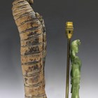 A Chinese carved hardwood figure of a monk, 20th century, height 46.5cm, and a simulated green hardstone figure of a maiden, mounted as a table lamp.