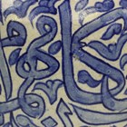 An Islamic blue and white tin glazed earthenware jug, early to mid-20th century, the stout baluster body painted with a broad band of script below a foliate band, height 23.5cm.