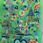 A Chinese green silk embroidered apron skirt, early 20th century, worked in coloured threads with floral panels within black borders, length 92cm.