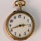 A two colour gold cased keyless wind open-faced lady's fob watch with unsigned gilt cylinder movement, gold inner case, the enamelled dial with black Arabic numerals, the case back decorated with a wreath and tied ribbon bow, case diameter 2.7cm.