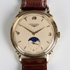 A Longines Automatic 14ct gold cased gentleman's wristwatch, circa 1950, the signed and jewelled 22A calibre movement numbered '8035443', the signed cream dial with subsidiary seconds and moonphase indicator and gilt Arabic and baton hour markers, the signed case back interior numbered '2653', case diameter 3.3cm, on a brown leather strap, with a Longines 'Extract from the Archives' certificate.