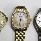 An Avia 9ct gold circular cased lady's wristwatch, the jewelled movement detailed 'Swiss made', the signed silvered dial with black Arabic numerals and subsidiary seconds, Birmingham 1950, case diameter 2.1cm, on a gilt metal fronted expanding metal bracelet, together with two further ladies' bracelet wristwatches, comprising Seiko Quartz and Rotary.