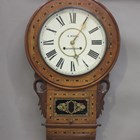 A late Victorian inlaid walnut drop dial wall clock with eight day movement striking on a gong, the painted circular dial with Roman numerals and inscribed 'A. Hays Ashburton', the circular surround and apron inlaid with geometric banding, flanked by carved foliate scrolls, height 71cm. Note: Adrian Hays was a German clockmaker and jeweller from Nussbach, Baden, who became a British subject in 1877 upon acquiring a Certificate of Naturalisation. He is recorded in Kelly's Directory of 1902 as a watchmaker living in North Street, Ashburton.