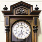 A late 19th century walnut and ebonized Vienna wall clock with eight day movement striking on a gong, the two piece enamel dial with subsidiary seconds and Roman hour numerals, the case with arched surmount and two turned finials above a glazed door with fluted columns and tapered apron, height 114cm, with pendulum.