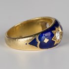 An 18ct gold, diamond and blue enamelled ring, star set with three circular cut diamonds against a blue enamelled ground, detailed '18ct', ring size approx O, with a case.
