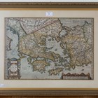 Abraham Ortelius - 'Graecia, Sophiani' (Map of Greece with Crete and Part of Asia Minor), late 16th century engraving with later colour, Latin text verso, 34cm x 50cm, within a gilt frame.