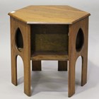 An early 20th century Arts and Crafts oak hexagonal book table, three sides pierced with teardrop motifs, flanked by open shelves, on open arched supports, height 55cm, width 52cm.