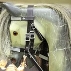 A Hadon dapple grey rocking horse with amber and black eyes, mane, tail and leather saddle and harness, on a black painted wooden stand, length 127cm.